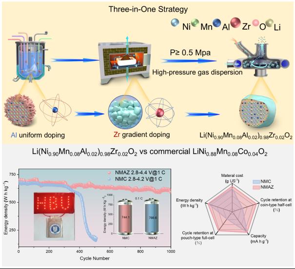 针对上述难题,研究团队采用共沉淀、固相烧结、高强气流粉碎三合一的制备策略,成功合成了高镍单晶正极材料Li(Ni0.90Mn0.08Al0.02)0.98Zr0.02O2(NMAZ)。通过非磁性的元素掺杂设计,有效解决了材料的结构与界面稳定性难题:Al作为无磁矩元素,均匀掺杂于材料内部,可降低内部磁矩、稳定Ni的配位环境、减少高自旋Ni3+含量,从而抑制磁阻挫效应;Zr同样为无磁矩元素,被定向富集在材料表面,能够抑制Ni3+/Ni4+向表面聚集,构建稳定的锂离子传输通道。采用该正极材料制备的软包电池表现出优异的综合性能:在0.1 C充放电倍率下,展现出766.6 Wh·kg⁻1的材料能量密度;在1 C倍率下经过1000次循环后,仍保持86.9%的容量保持率。